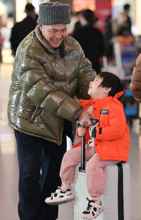 2月2日,在江蘇海安站出站口,小朋友跑向前來接站的家人。新華社發(顧彬斌攝)