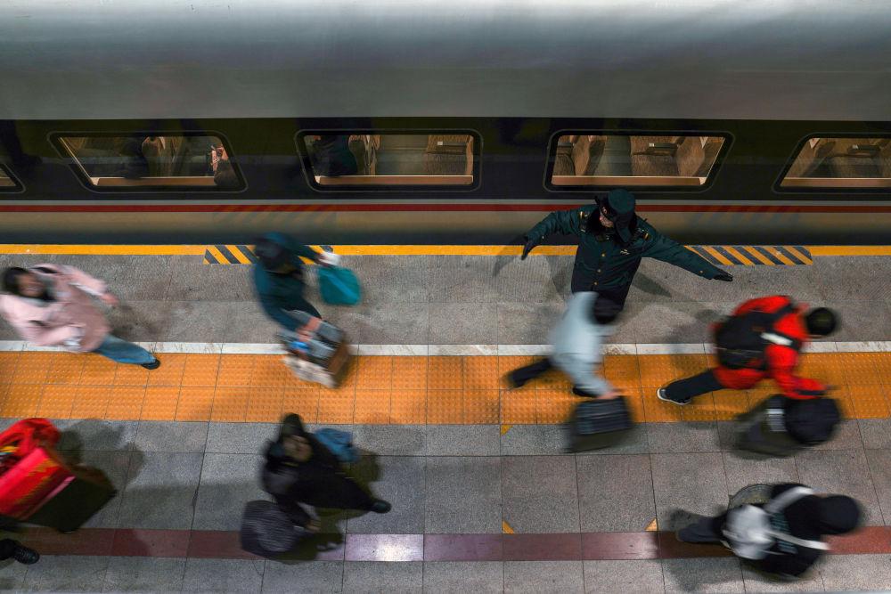 2月2日,在北京西站,乘坐G6701次列車的旅客在站臺工作人員引導下排隊乘車。新華社記者 鞠煥宗 攝