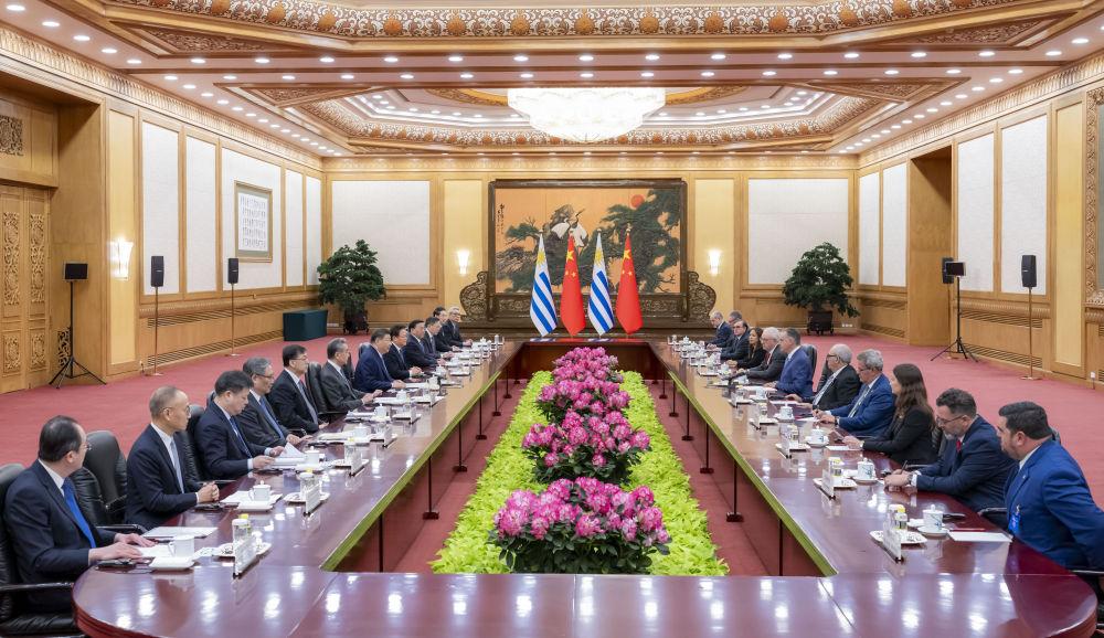 習近平指出,當今世界正處于百年未有之大變局,國際形勢變亂交織,單邊霸凌愈演愈烈,中方支持烏拉圭接任“77國集團和中國”輪值主席國,愿與烏方加強全球南方團結協作,共同推進平等有序的世界多極化、普惠包容的經濟全球化,攜手并進、共謀發展,為構建人類命運共同體作出更大貢獻。中方始終重視中拉關系,支持拉美和加勒比國家維護自身主權、安全、發展利益,支持烏拉圭接任拉美和加勒比國家共同體以及南方共同市場輪值主席國,愿同烏方和地區國家推動共建中拉命運共同體走深走實。