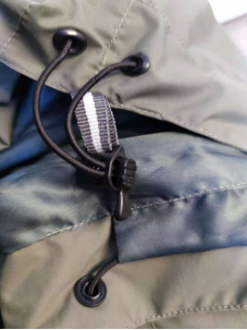 外件帽子可拆卸,兩側各有一個松緊扣(樣式詳見圖4),使用3#樹脂拉鏈與外件領子連接,帽子底部兩側、中間有三個魔術貼(毛)與外件兩側衣領、中間魔術貼(鉤)粘合。